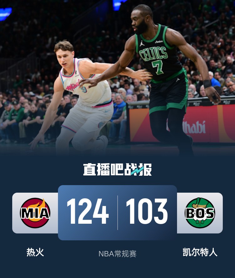 热火(35-41):希罗25分6板9助2断、阿德巴约21分5板6助、李凯尔19分1板1助、拉松16分4板4助、米切尔13分4板7助3断、海史密斯10分4板、伯克斯10分2板、韦尔7分5板、克里斯托弗3分、史蒂文斯2板、哈克斯1板1助