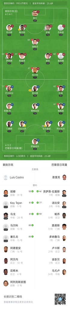 下半场补时5分钟。最终全场比赛结束,敦刻尔克2-4巴黎。