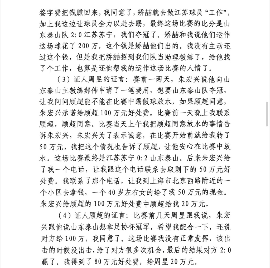 周昱的证言:赛前一两天,朱宏兴说他向山东泰山主教练郝伟申请了一笔费用,想要山东泰山队夺冠,让我问问顾超能不能在比赛中踢假球放水,如果顾超同意,朱宏兴承诺给顾超100万元好处费。比赛前一天晚上我联系顾超,顾超同意。比赛当天上午我把顾超同意放水的事情告诉朱宏兴,朱宏兴为了表示诚意,在比赛开始前就给我转了50万元,我把这个情况也告诉了顾超,让他安心在比赛中放水。这场比赛最终是江苏苏宁0:2山东泰山。后来朱宏兴给了我一个电话,让我跟这个电话联系去取剩下的50万元好处费。我联系了那个电话,让我到上海市北京西路附近的一个小区去拿钱,一个40岁左右女的给了我50万元的现金。朱宏兴给顾超的100万元好处费中顾超给我20万元。