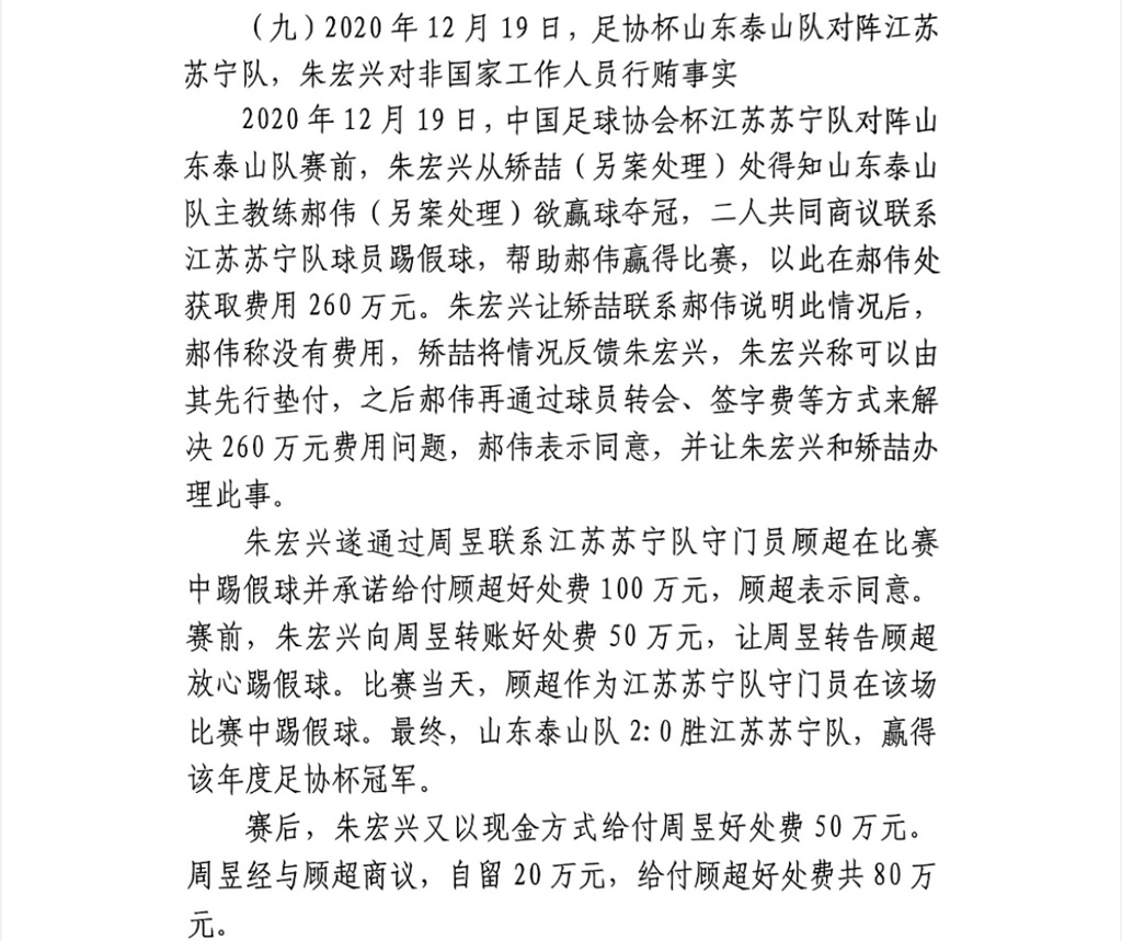 网传判决书:20年足协杯决赛泰山vs江苏存在假球,顾超收80万放水