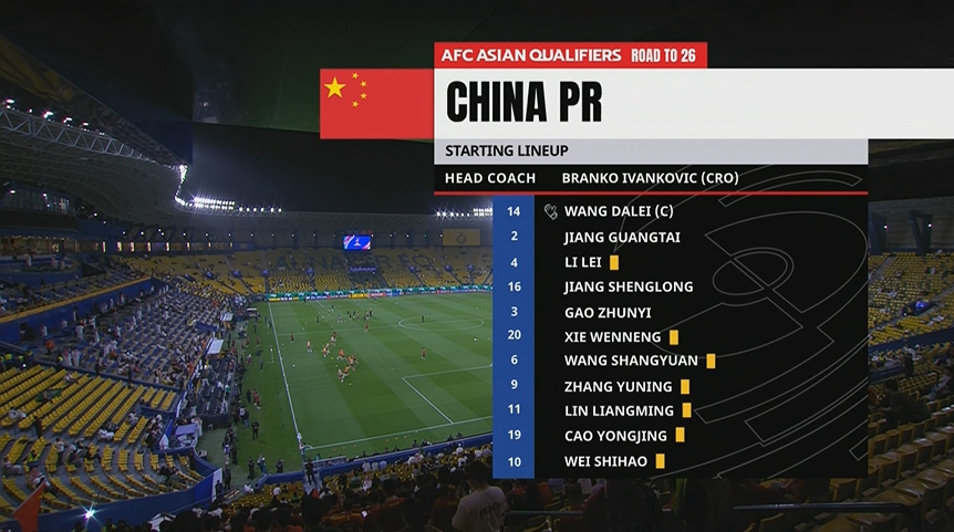 国足替补:1-颜骏凌、12-刘殿座、5-魏震、15-杨泽翔、18-韩鹏飞、13-胡荷韬、7-徐皓阳、21-汪海健、17-塞尔吉尼奥、8-李源一、22-王子铭、23-拜合拉木